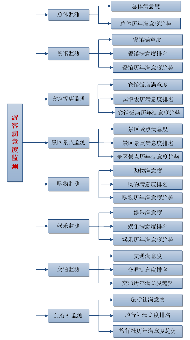 ● 總體監(jiān)測:監(jiān)測當(dāng)前游客對(duì)旅游行業(yè)的總體滿意度,并分析歷年總體滿意度的發(fā)展趨勢;