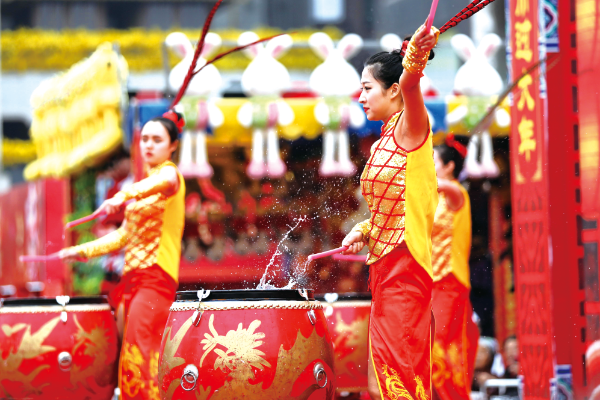 △ 2018年3月2日,幾位靚麗的女孩子在廣場上表演擊鼓。當(dāng)日是中國傳統(tǒng)節(jié)日元宵節(jié),數(shù)萬民眾來到西安大唐西市,熱鬧逛廟會、欣賞民俗表演。張遠(yuǎn)攝