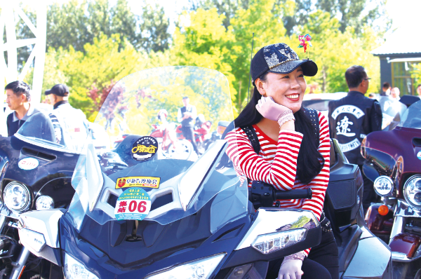 △ 2018年8月5日,“漫游之旅”——2018(通遼)第三屆科爾沁500公里風(fēng)景大道自駕游活動啟動,圖為游客在機車上拍照留念。陳鳳攝