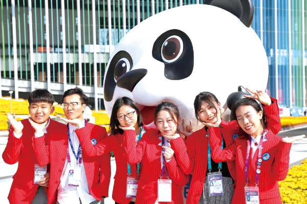 △ 2018年11月10日,首屆中國國際進(jìn)口博覽會完滿閉幕。進(jìn)博會志愿者“小葉子”在國家會展中心(上海)合影留念。張亨偉攝