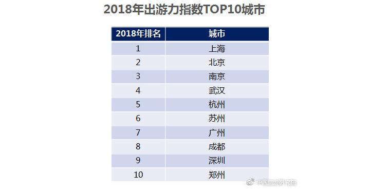 從區(qū)域分布來看,出游力指數(shù)仍呈現(xiàn)東南沿海地區(qū)較高、西北地區(qū)較低的局面,但中西部地區(qū)出游力指數(shù)與東部地區(qū)差距有所縮小。2018年全國城市居民出游力指數(shù)排名前十位的城市依次是上海、北京、南京、武漢、杭州、蘇州、廣州、成都、深圳、鄭州。(數(shù)據(jù)說明:城市出游力指數(shù)是指該城市居民旅游消費(fèi)支出占該城市居民消費(fèi)總支出的比重)