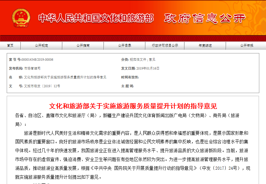 2019開年之際,文化和旅游部印發(fā)了《關(guān)于實施旅游服務(wù)質(zhì)量提升計劃的指導意見》(以下簡稱《指導意見》)。