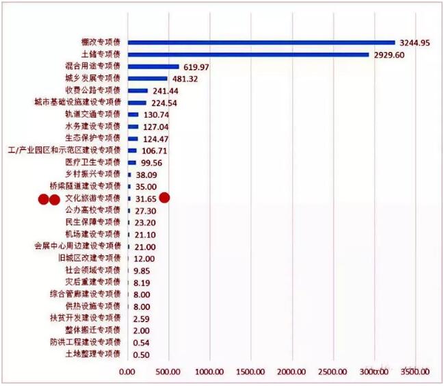 從今年1—5月新增專項(xiàng)債發(fā)行的品種和投向看,不難會發(fā)現(xiàn)在27類新增專項(xiàng)債品種中,棚改專項(xiàng)債超越土儲專項(xiàng)債以3244.95億元高居首位,其次是土儲專項(xiàng)債2929.60億元、城鄉(xiāng)發(fā)展專項(xiàng)債481.32億元、收費(fèi)公路專項(xiàng)債241.44億元。而用于文化旅游專項(xiàng)債31.65億元,位居第14位(見圖5)。這充分說明了,文化旅游作為地方政府專項(xiàng)債重點(diǎn)項(xiàng)目已經(jīng)成為不爭的事實(shí)。