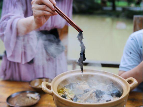 巖耳洗凈,單獨成盤。待雞湯沸騰,咕嚕咕嚕冒出熱氣,這時,夾起一塊巖耳,放進湯里,七上八下涮一下,即可享用,感受入口那一刻的鮮、嫩、滑、脆。
