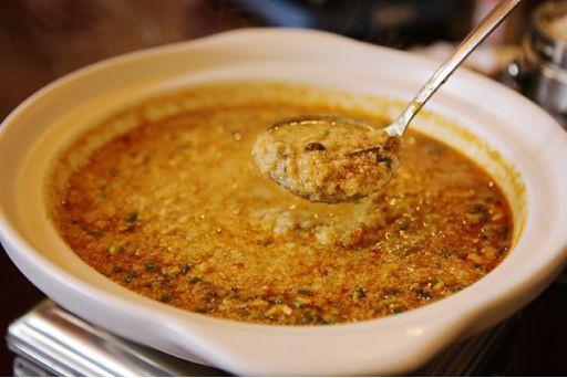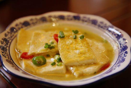 雖是家常菜式,“山溝溝”卻做得精致地道。泉水充分泡發(fā)黃豆,放進石磨,現(xiàn)磨出漿,再濾渣,點鹵。豆腐的燒法也不復(fù)雜,薄片雙面煎黃,再拿濃湯一煨,出鍋撒點蔥花點色,調(diào)味料擱得極少,最大程度上保證了泉水豆腐的鮮甜。