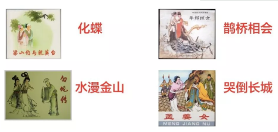 梁祝是化蝶、牛郎織女是一年一次的七夕鵲橋會、孟姜女是哭倒長城、白蛇傳是水漫金山加雷鋒塔