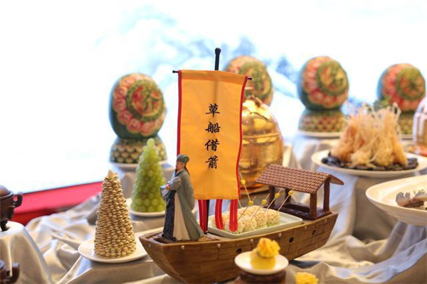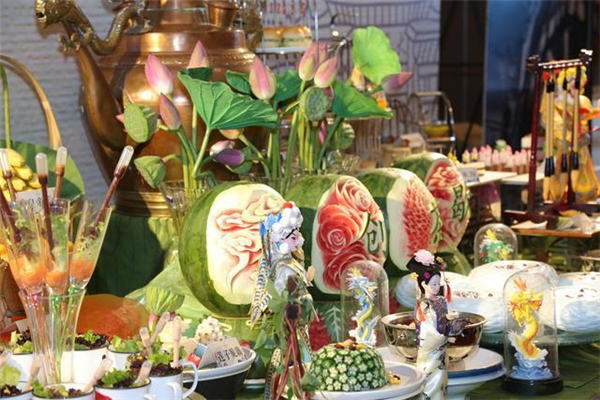 在文化創(chuàng)意主題宴席比賽環(huán)節(jié),各酒店更是“使勁渾身解數(shù)”“拿出看家本事”。在銀座泉城大酒店宴席,一個外形雕刻精致細(xì)膩的空心西瓜中,一只雞靜靜地臥于其中。甫一上桌,這道泉水西瓜雞就賺足評委們的眼球。山東東方大廈創(chuàng)新性打造的“東方琉璃喜宴”,也給評委們留下深刻印象。索菲特銀座大飯店的齊魯文化名宴,以齊魯十二名人故事為背景,打造出“草船借箭”“孟母三遷”“藕花深處”等形神皆備的菜品,再配上獨(dú)具特色的敬茶禮,中國傳統(tǒng)文化、儒家文化于無聲處滲透到每位賓客心中。舜耕山莊的上合孔府家宴、山東禧悅東方大酒店的東方魯韻宴、中豪大酒店的雨荷素食宴、銀座泉城大酒店的泉水主題宴等也頗具特色。