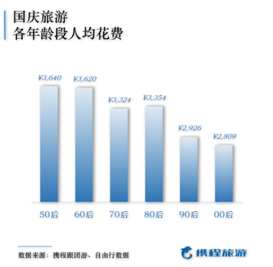什么年齡段的中國人更偏愛在國慶出行?根據(jù)攜程跟團(tuán)游和自由行訂單數(shù)據(jù),80后和90后已經(jīng)成為國慶出游的絕對主力人群,占出行總?cè)藬?shù)的51%。而報告顯示,在各年齡段的花費上,50后成為最舍得花錢的人群,單次旅游人均花費達(dá)到了3640元。