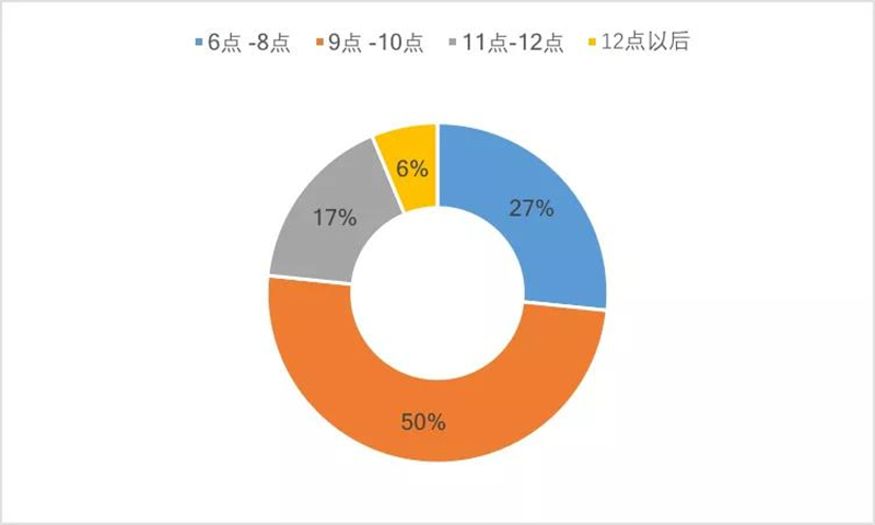 專項調(diào)查數(shù)據(jù)顯示,夜間6-10點(diǎn)為夜間旅游的高峰時段,占比達(dá)到77%;11-12點(diǎn)%及12點(diǎn)以后夜間旅游占比23%。從夜游體驗時長來看,愿意體驗3-4小時的游客最多,占比為48.1%,體驗1-2小時的比重為27.5%,體驗5-6小時的比重為17.1%,體驗7小時以上占比7.2%。