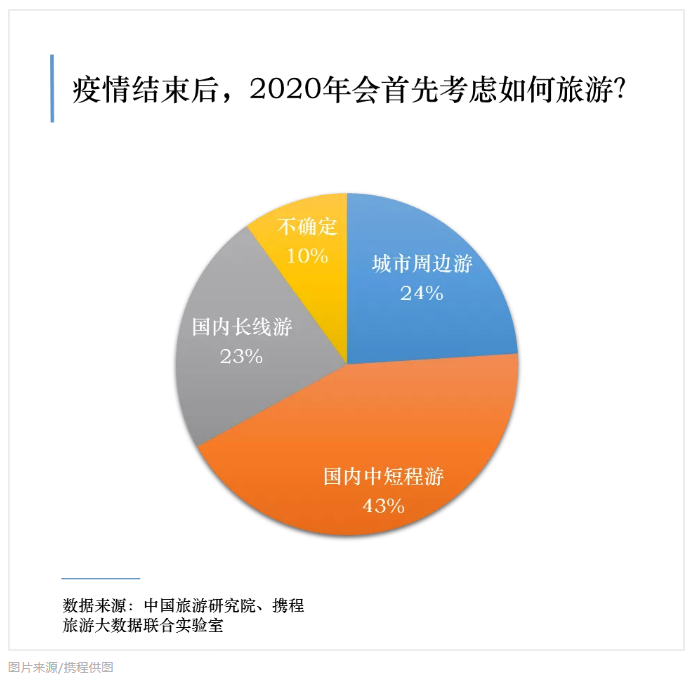 疫情結(jié)束后會(huì)先去哪里旅游?有90%以上的被調(diào)查者選擇國(guó)內(nèi)游。其中,城市周邊游、國(guó)內(nèi)中短程游、國(guó)內(nèi)長(zhǎng)線游是主要選擇,分別占比24%、43%、23%。目前在線旅游平臺(tái)產(chǎn)品上線和預(yù)訂情況也符合這一趨勢(shì),景區(qū)門票、門票+酒店套餐、周邊游線路率先復(fù)蘇。