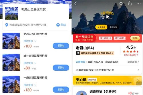 在景區(qū)實行單日最高人數(shù)限制的同時,開通多個旅游預(yù)約通道,游客可通過美團(tuán)網(wǎng)、攜程網(wǎng)、同程旅游網(wǎng)、去哪兒網(wǎng)及老君山景區(qū)微信公眾號等多平臺實行景區(qū)門票預(yù)約服務(wù),加強客流量智慧監(jiān)控。
