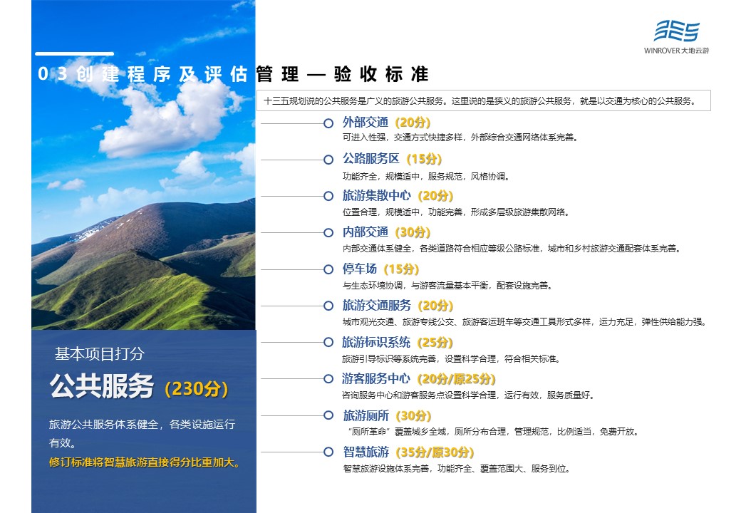 其中,基本打分項(xiàng)目主要由機(jī)制體制(90分)、政策保障(140分)、公共服務(wù)(230分)、供給體系(240分)、秩序與安全(240分)、資源與環(huán)境(100分)、品牌影響(60分)等7大項(xiàng)構(gòu)成。根據(jù)最新修訂結(jié)果,將公共服務(wù)中游客服務(wù)中心的25分,降為20分,同時(shí)加大智慧旅游分?jǐn)?shù)占比,將原本的30分,提升為35分。