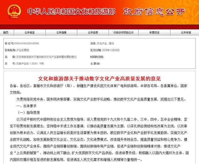 11月26日,文化和旅游部發(fā)布《關(guān)于推動(dòng)數(shù)字文化產(chǎn)業(yè)高質(zhì)量發(fā)展的意見(jiàn)》。意見(jiàn)提出,培育和塑造一批具有鮮明中國(guó)文化特色的原創(chuàng)IP,加強(qiáng)IP開(kāi)發(fā)和轉(zhuǎn)化;鼓勵(lì)數(shù)字文化企業(yè)參與企業(yè)級(jí)數(shù)字基礎(chǔ)設(shè)施開(kāi)放合作;支持“新技術(shù)、新業(yè)態(tài)、新模式”企業(yè)發(fā)展,扶持中小微數(shù)字文化企業(yè)成長(zhǎng);支持符合條件的數(shù)字文化企業(yè)利用多渠道資本市場(chǎng)融資;支持利用數(shù)字技術(shù)打造夜間文化和旅游產(chǎn)品。