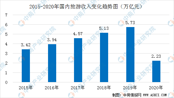 旅游收入數(shù)由2015年的3.42萬(wàn)億元增至2019年的5.73萬(wàn)億元。2020年國(guó)內(nèi)旅游收入2.23萬(wàn)億元,比上年同期減少3.50萬(wàn)億元,下降61.1%。其中,城鎮(zhèn)居民出游花費(fèi)1.80萬(wàn)億元,下降62.2%;農(nóng)村居民出游花費(fèi)0.43萬(wàn)億元,下降55.7%。據(jù)中國(guó)旅游研究院發(fā)布的《2021年第一季度旅游經(jīng)濟(jì)運(yùn)行分析與上半年趨勢(shì)預(yù)測(cè)》,國(guó)內(nèi)旅游收入0.56萬(wàn)億元,同比增長(zhǎng)150%。