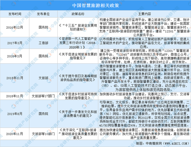 國(guó)家重視智慧旅游產(chǎn)業(yè)發(fā)展,出臺(tái)了《“十三五”旅游業(yè)發(fā)展規(guī)劃的通知》、《國(guó)務(wù)院辦公廳關(guān)于促進(jìn)全域旅游發(fā)展的指導(dǎo)意見(jiàn)》、《國(guó)務(wù)院辦公廳關(guān)于進(jìn)一步激發(fā)文化和旅游消費(fèi)潛力的意見(jiàn)》《關(guān)于深化“互聯(lián)網(wǎng) 旅游”推動(dòng)旅游業(yè)高質(zhì)量發(fā)展的意見(jiàn)》等政策,鼓勵(lì)和引導(dǎo)智慧旅游產(chǎn)業(yè)發(fā)展。