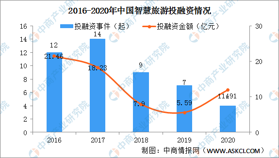2017年以來(lái),我國(guó)智慧旅游投融資事件持續(xù)減少,2020年受疫情影響,旅游業(yè)受重挫,智慧旅游投融資事件僅4起,投融資金額11.91億元,同比增長(zhǎng)113.06%。智慧旅游領(lǐng)域投融資更為謹(jǐn)慎,資本青睞較為成熟的項(xiàng)目。