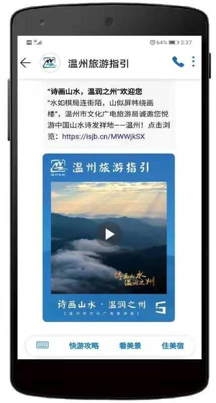 自《溫州旅游指引》上線以來,引起了用戶的廣泛關注,在文旅行業(yè)也成為熱門話題。來溫參加“詩畫溫州,溫潤之州”長三角職工療休養(yǎng)交流大會的上海用戶徐先生說,我到溫州雁蕩山參加療休養(yǎng)交流大會,一下動車就收到溫州文旅推送的“詩畫山水,溫潤之州—歡迎您”手機消息,感覺不錯。以前到過很多城市,收到過文字版的歡迎短信,這次在溫州收到的這種帶高清視頻的消息,體驗感更好,獲取的信息更全面,點擊翻閱里面內容,也正是我想了解的。其中的“美景”“美食”“美宿”版塊內容對我最有吸引力,我很想品品地道的溫州小吃,看看溫州的夜景。