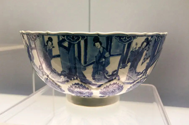 這件館藏于江西省博物館的清乾隆時(shí)期的青花仕女盤,是典型的外銷瓷款。盤內(nèi)口沿及腹壁繪以帶狀花卉紋,盤心開(kāi)光內(nèi)繪有一位仕女。這位仕女有些與眾不同——她有著一頭濃密的卷發(fā),身著束腰洋裝,盡顯異域風(fēng)情。