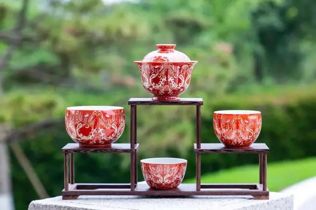 其中,粉彩錯金銀虎嘯鳳吟系列,是一件不可多得的佳器名品。整套茶具紋飾以館藏文物唐代金鳳飾件為設(shè)計靈感。金鳳雙翅展開,兩足蹬地,振翅欲飛的姿態(tài)生動逼真。在中國古代傳統(tǒng)文化中,鳳凰被視為瑞鳥,是鳥中之王。通過對金鳳飾件進行提取,設(shè)計出鸞鳥紋,鳳紋羽翼展開可合為院徽圖形,整體構(gòu)成虎頭紋。茶具沿用藝林堂的粉彩工藝,采用錯金銀的呈現(xiàn)效果,不僅讓這只“鳳”更有“活性”,也讓器物更有精細感,正紅的底色也呈現(xiàn)出“紫禁紅”“中國紅”的極佳效果,在保留和傳播傳統(tǒng)文化的同時,也符合當下的審美需求。