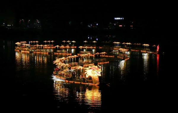 夜幕降臨,華燈初上。近兩年成為黃山文旅產(chǎn)品爆款的百米金龍從流光溢彩的橫江中蜿蜒游來。除了集中展示的如愿燒火塔、齊云打鐵花、白岳煙花秀外,還有噴火、炭花舞、齊福儺舞等節(jié)目,火花、煙花交織,展現(xiàn)出齊云山度假區(qū)煥新出發(fā)的力量,照射出“越夜越精彩”的休寧魅力,更折射出新一年?duì)钤輰幭蛏舷蛐碌牧α俊?/span>
