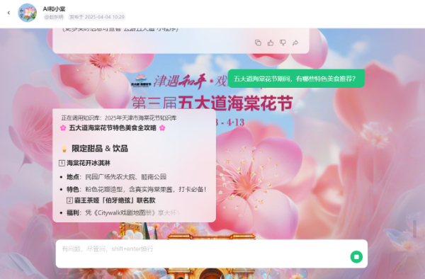 “2025海棠花節(jié)亮點有哪些?”游客對著手機(jī)提問,屏幕上甜美的虛擬形象“和小棠”即刻響應(yīng):“本屆海棠花節(jié)包含177場文化演藝活動,覆蓋睦南公園沉浸式電競展演、金街非遺市集等...”這位虛擬導(dǎo)游裝載了和平區(qū)文旅局授權(quán)的200余條專業(yè)知識,以DeepSeek大模型為技術(shù)底座,構(gòu)建了強(qiáng)大的文旅知識庫。
