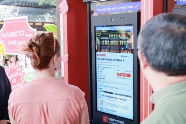 上海豫園,一位外國游客站在新設立的“Meet China”數(shù)字大屏前,輕輕一刷國際銀行卡,便順利購買了特色文創(chuàng)產品,全程不到一分鐘。
