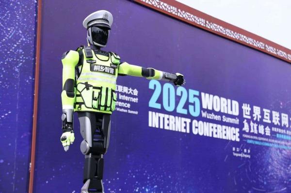 智能眼鏡為外國(guó)游客實(shí)時(shí)翻譯并指引路線,巡邏隊(duì)員的無人機(jī)在空中緩緩飛行監(jiān)測(cè)客流,輪臂式交通指揮機(jī)器人抬臂指引車流——在烏鎮(zhèn),智慧生活場(chǎng)景早已融入日常。