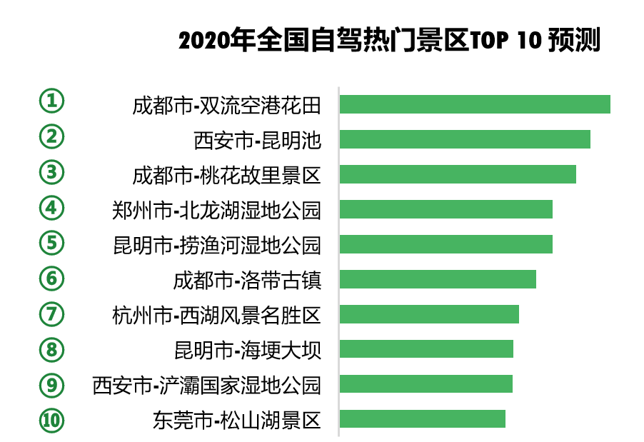 清明假期期間,從自駕出行方面來看,市民更熱衷于公園、湖邊等戶外區(qū)域,熱門景區(qū)Top10中,成都占3席,西安、昆明各占2席,成都雙流空港花田排名第一。