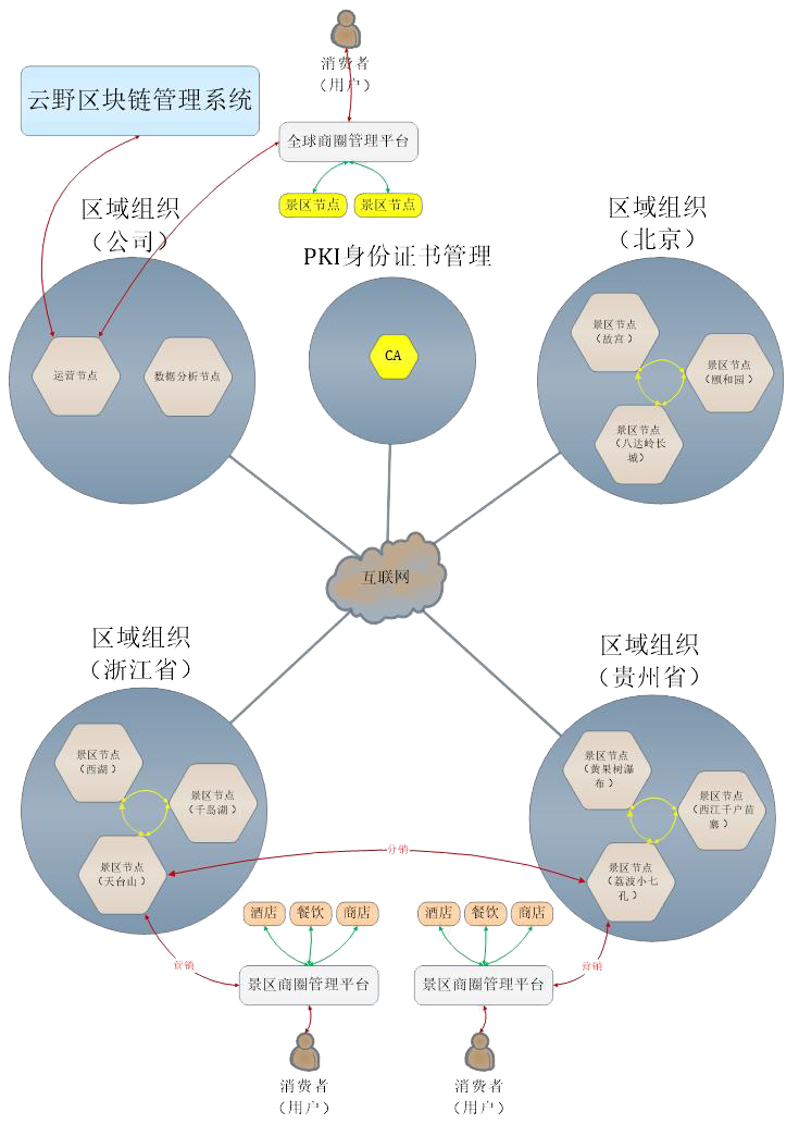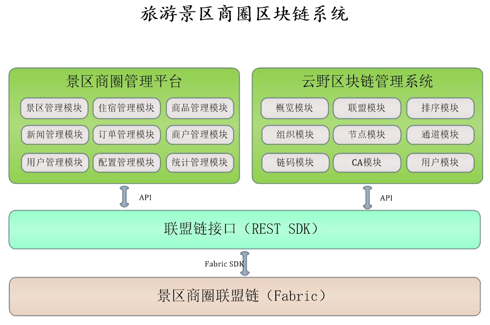 旅游景區(qū)商圈區(qū)塊鏈系統(tǒng)是建立在Hyperledger Fabric聯(lián)盟鏈區(qū)塊鏈基礎之上,以景區(qū)作為節(jié)點,實現以景區(qū)為中心的商圈管理系統(tǒng)。本系統(tǒng)分為景區(qū)商圈聯(lián)盟鏈、聯(lián)盟鏈接口和景區(qū)商圈管理平臺三大子系統(tǒng)。