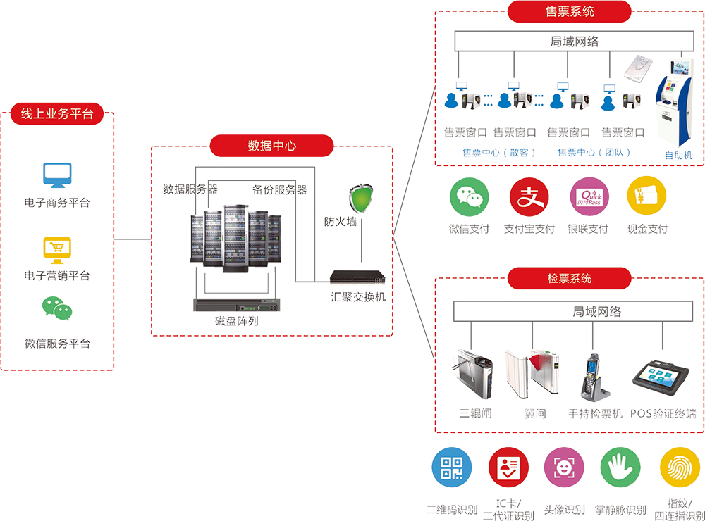 包含線下電子票務(wù)系統(tǒng),線上分銷平臺、電子商務(wù)平臺、微信服務(wù)平臺等,通過線上業(yè)務(wù)系統(tǒng)進(jìn)行產(chǎn)品預(yù)訂,數(shù)據(jù)同步匯總至數(shù)據(jù)中心,線下系統(tǒng)進(jìn)行取票、驗證,實(shí)現(xiàn)了線上、線下一體化的功能,售票支持微信、支付寶、銀聯(lián)、現(xiàn)金等支付模式,驗票支持二維碼、IC卡/二代證、頭像識別、掌靜脈、四連指等識別模塊,功能結(jié)構(gòu)圖如下: