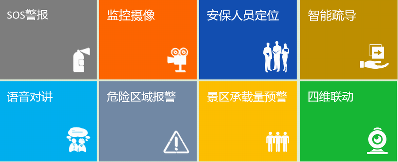 SOS警報、監(jiān)控攝像、安保人員定位、語音對講、危險區(qū)域報警、景區(qū)承載量預警、智能疏導、四維聯(lián)動等