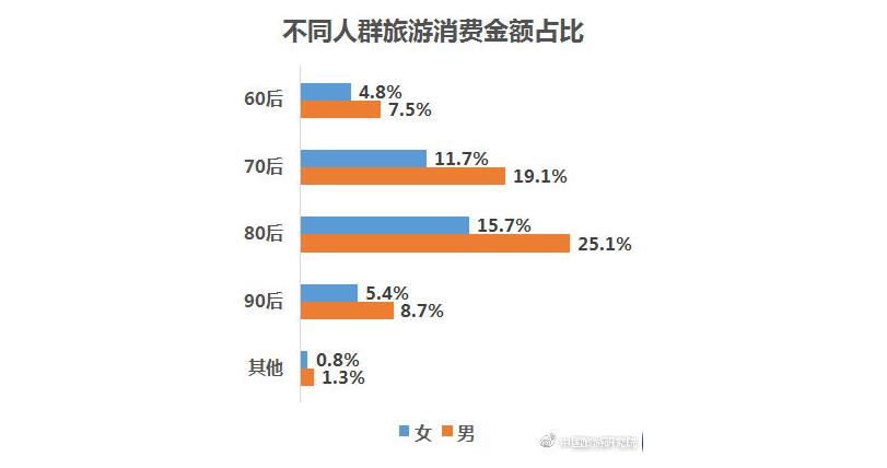 報(bào)告顯示,旅游消費(fèi)人群中,買單男性多于女性,70后及80后人群為主力消費(fèi)人群,90后人群數(shù)量快速增長。從旅游消費(fèi)金額來看,80后男性旅游消費(fèi)貢獻(xiàn)最高,占比超25%。