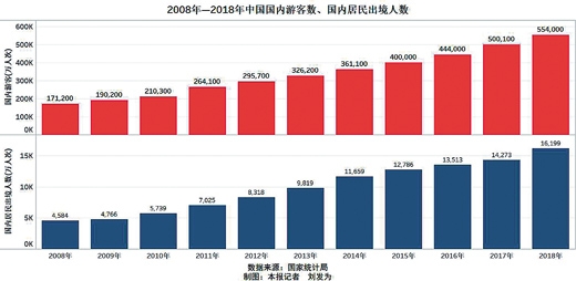 十年間,我們在旅途中的時(shí)間越來越多,也有越來越多的人踏上旅途。據(jù)國家統(tǒng)計(jì)局?jǐn)?shù)據(jù)顯示,2018年中國國內(nèi)游客出游55.4億人次,這一數(shù)據(jù)是2008年17.1億人次的3倍還要多;2018年中國居民出境人數(shù)達(dá)1.62億人次,而在2008年只有4584萬人次。