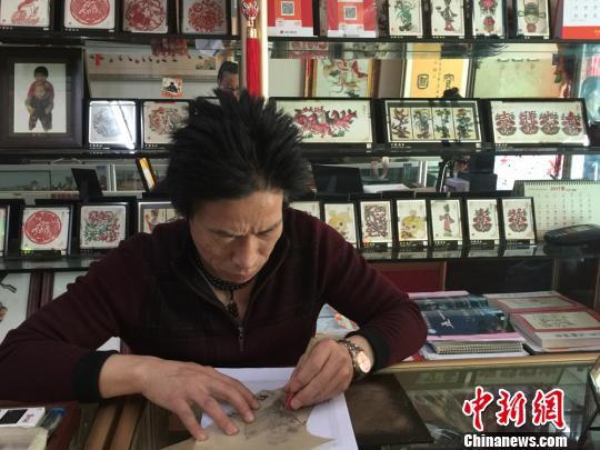 甘肅皮影雕刻藝人趙德才伏案按照紙質(zhì)模板雕刻皮影?!⒀γ?攝