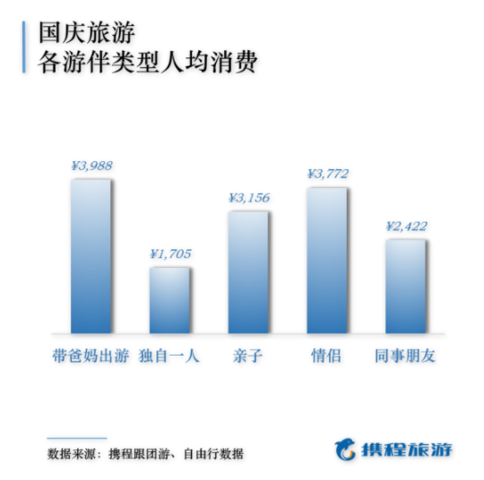 什么年齡段的中國人更偏愛在國慶出行?根據(jù)攜程跟團(tuán)游和自由行訂單數(shù)據(jù),80后和90后已經(jīng)成為國慶出游的絕對主力人群,占出行總?cè)藬?shù)的51%。而報告顯示,在各年齡段的花費上,50后成為最舍得花錢的人群,單次旅游人均花費達(dá)到了3640元。