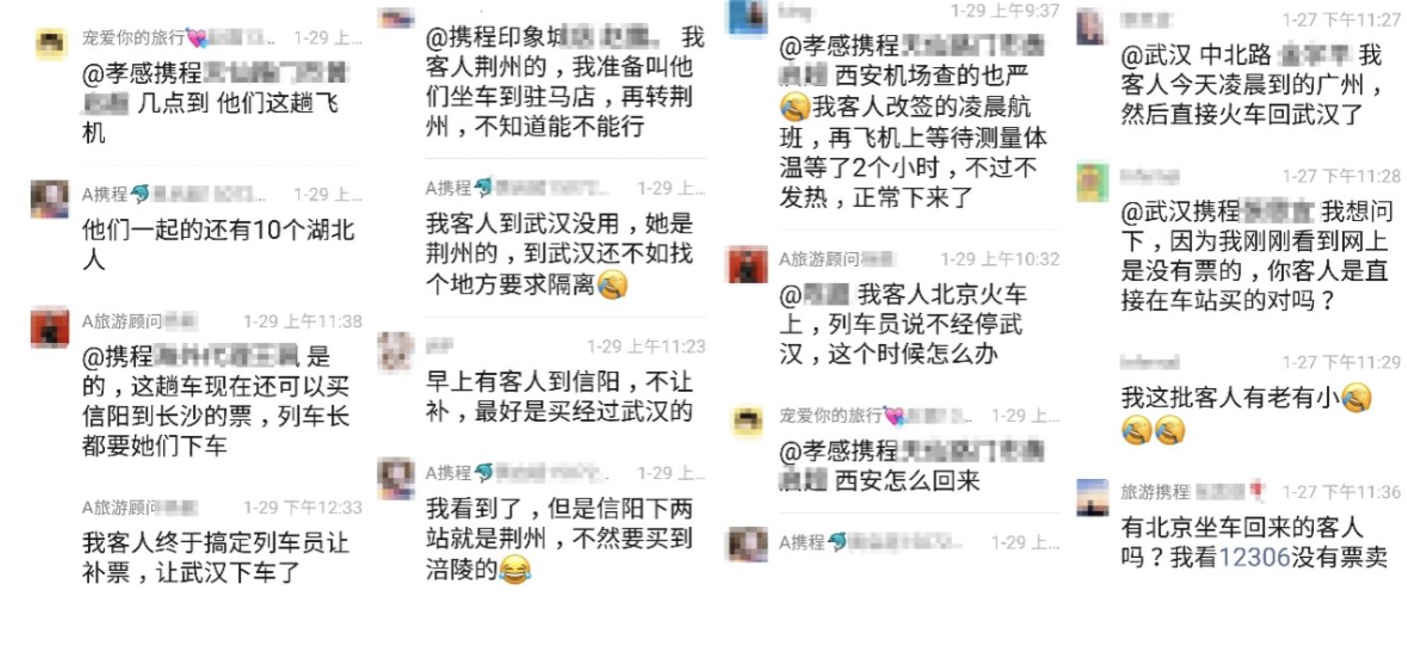 鈦媒體從攜程旅游渠道事業(yè)部CEO張力處了解到,遍布全國一二線城市、甚至下沉到縣城的7000家攜程旅游門店員工,攜程門店、攜程向?qū)ё园l(fā)組建一個個信息互助群,幫助武漢客人求信息、求住宿、求回家攻略?!懊總€店的員工多是本地人,他們深諳當?shù)亟煌ㄗ∷扌畔?,有豐富的旅游人脈和社會資源”。