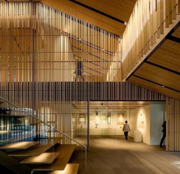 建筑層高低矮,主要材料是鋼和玻璃,立面和內(nèi)部裝飾大部分采用當(dāng)?shù)啬静模c環(huán)境完美協(xié)調(diào)。室內(nèi)景觀,隈研吾也以自己一貫的風(fēng)格做了設(shè)計(jì):若有似無(wú)的空間隔斷、視野開(kāi)闊的大面落地窗、簡(jiǎn)潔但充滿細(xì)節(jié)的空間布局。