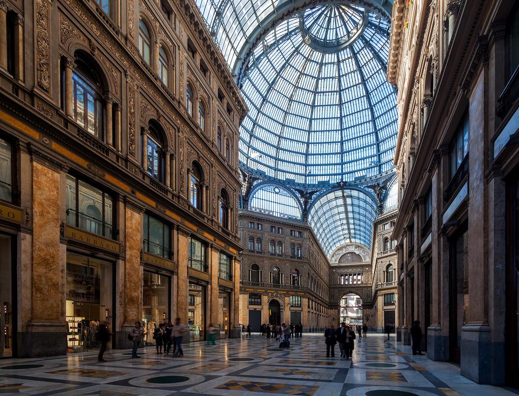 冬日的暖陽(yáng)下,地中海的海風(fēng)穿過(guò)意大利那不勒斯王宮廣場(chǎng),吹進(jìn)翁貝托一世長(zhǎng)廊。長(zhǎng)廊外部設(shè)有4個(gè)巨大的入口拱門,內(nèi)部?jī)蓷l步行街呈十字形交叉。透過(guò)泛著蔚藍(lán)色的玻璃穹頂,陽(yáng)光灑進(jìn)步行街。始建于1887年的翁貝托一世長(zhǎng)廊,是意大利最具代表性的商業(yè)步行街之一。