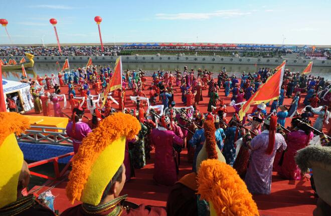 在新疆博湖縣博斯騰湖大河口景區(qū),非遺傳承人和民間藝人們共同表演蒙古族短調(diào)民歌。