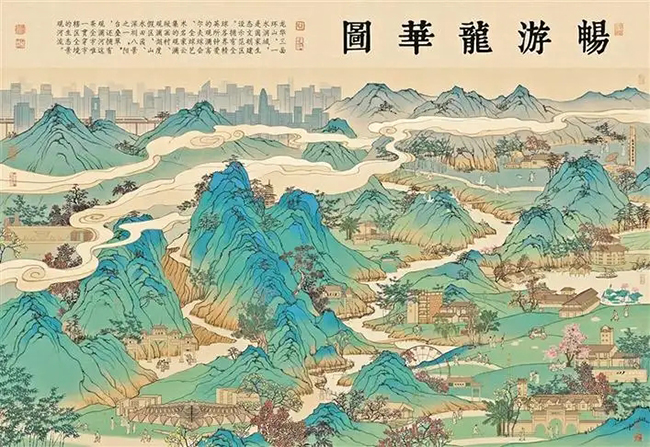 而以“水墨畫”畫風、造型為改造藍本,依照龍華高低錯落的山形、生態(tài)環(huán)境進行創(chuàng)作的手繪地圖,也格外吸引人們的關(guān)注。地圖采取向傳統(tǒng)“借畫”形式,以青綠山水畫為主導,通過下、中、上三部分景致的描繪,展現(xiàn)龍華全域旅游面貌?!跋戮皣@觀瀾古墟、版畫基地、高爾夫球場、鰲湖藝術(shù)村等景點作畫;中景描繪陽臺山、大浪時尚小鎮(zhèn)等景點,運用蒙太奇手法,以觀瀾河為分界線,區(qū)分下景與中景;上景則呈現(xiàn)深圳北站、高鐵以及整個龍華都市剪影?!必撠熗七M龍華手繪地圖項目的負責人、藝術(shù)家蘇云龍介紹道,手繪地圖表現(xiàn)出龍華原始生態(tài)、歷史人文以及都市核心層層遞進的關(guān)系,以傳統(tǒng)文化與現(xiàn)代建筑的對比形成視覺沖擊,達到“遠觀有畫,近看有景”的效果。