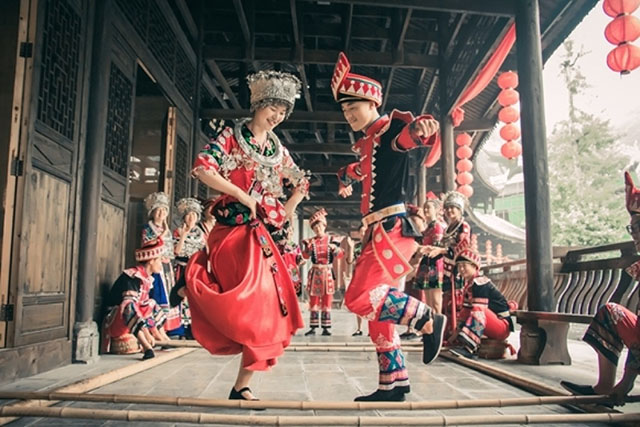 “苗食”慰藉脾胃,“苗舞”愉悅身心。吃飽喝足,游客還可體驗苗家婚嫁習(xí)俗,精彩的苗俗展演從早到晚不停歇。