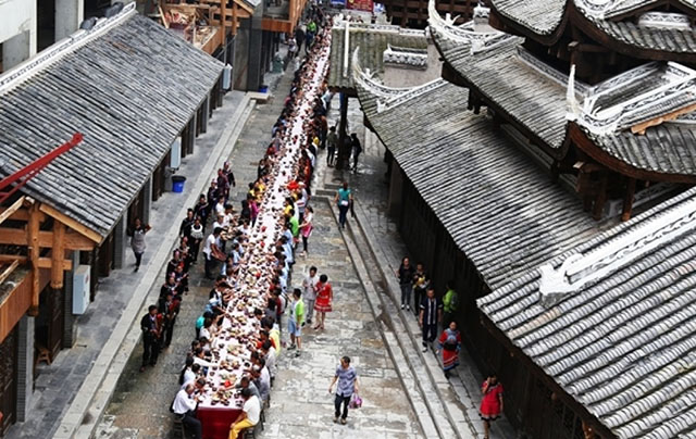 穿過畎夷門后的“時空隧道”,菜香撲鼻——正值晌午,百米長桌宴上,苗家九大碗等特色美食,正引得來客大快朵頤。