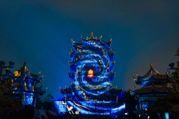 《夜上黃鶴樓》是由武漢市園林和林業(yè)局、武漢文旅集團聯(lián)合黃鶴樓公園共同打造,集實景化、行浸式、體驗型于一體的文化旅游演藝。這一項目通過激光投影、激光動畫、高壓水霧等高科技光影技術(shù),融入藝術(shù)表演方式,打造武漢市地標(biāo)夜游新體驗。