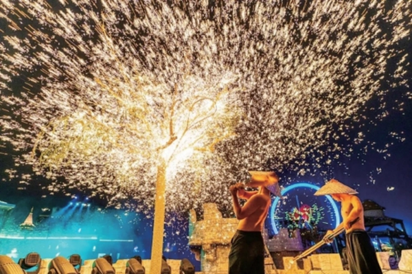在九頂塔中華民族歡樂園內(nèi),每天30余項歌舞表演、民間絕技,300場次異域風情和少數(shù)民族風情演出分別在非洲部落、苗寨、傣寨、佤寨、彝寨、侗寨等十余個民族村寨循環(huán)上演。夜幕降臨,大型篝火晚會《香格里拉之夢》點燃夜空下最熱烈的激情,30多個風情歌舞接續(xù)上演,現(xiàn)場更有精彩絕倫的“火龍鋼花”震撼演出。再加上各項實景演出,游客穿梭于不同場景中,既是觀眾,又是“親歷者”,沉浸式體驗一場不落幕的文化盛宴。